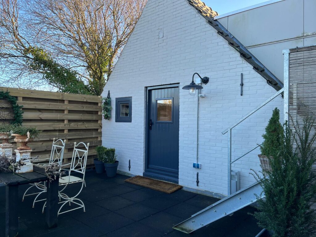 De linkerdeur geeft toegang, via de trap en de hal naar het appartement. U hebt een eigen opgang, dus 100 % privacy.